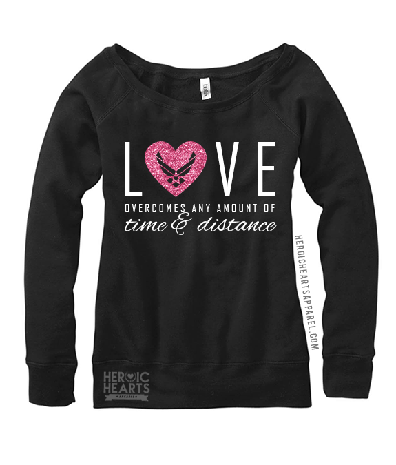 "Love overcomes any amount of time & distance." Choose your apparel option and your print colors to make this completely customizable for you! Unsure of sizing? Click here for a size chart.