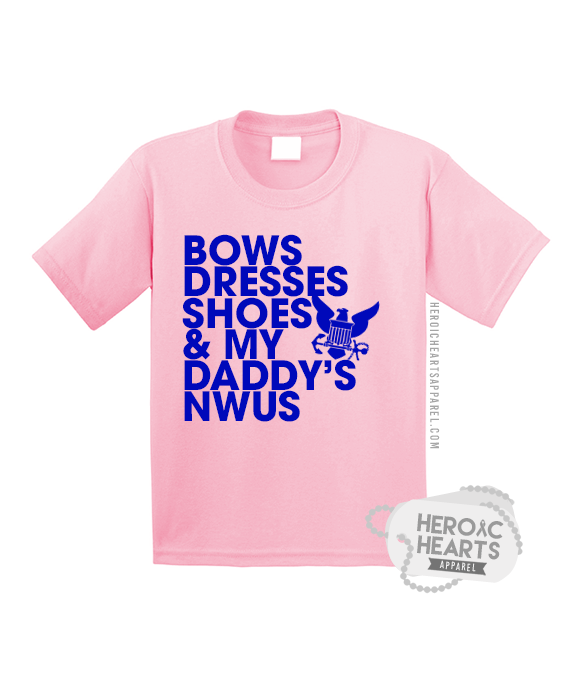 "Bows, dresses, shoes, & my daddy's NWUs". Cute and adorable design, perfect for the daughter of a Sailor. "Daddy" can also be changed to a different relationship. Choose your size and apparel option below.