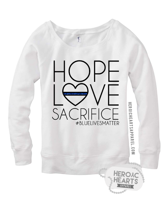 "Hope, Love, Sacrifice. #Bluelivesmatter" top. Proudly supporting our law enforcement and the men and women who support them. Choose your apparel option and print color to make this completely customizable for you! Unsure of sizing? Click here for a size chart.