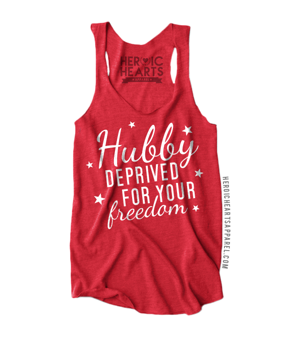 "Hubby deprived for your freedom!" Choose your apparel option and print color to make this completely customizable for you! Unsure of sizing? Click here for a size chart.