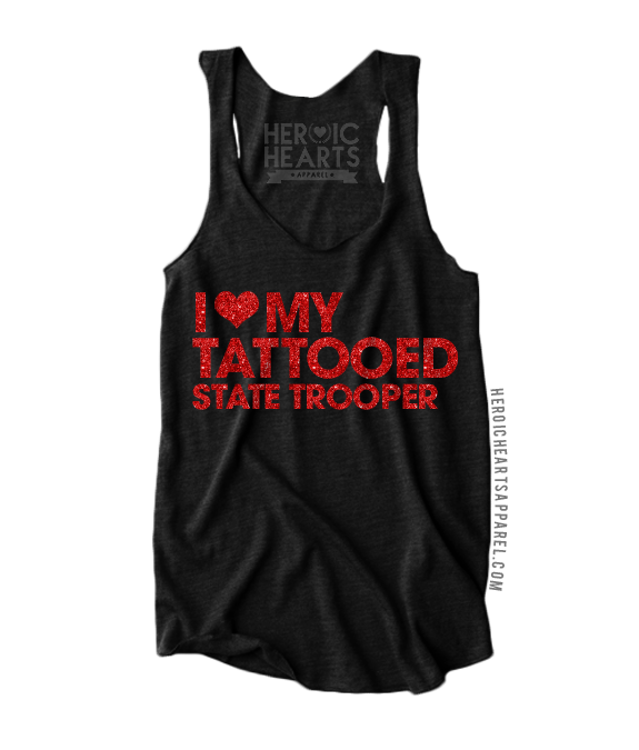 "I Love My Tattooed State Trooper", law enforcement shirt. Choose your apparel option and print color to make this completely customizable for you! Unsure of sizing? Click here for a size chart.