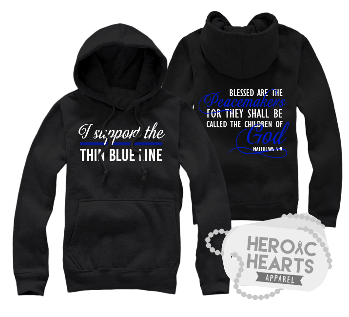 This design features "I Support the Thin Blue Line" on the front in white text with a thin blue line. Back reads "Bless are the Peacemakers for they shall be called the children of God. Matthews 5:9". Show your support for our LEO's.