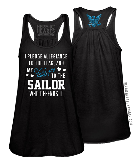 "I pledge allegiance to the flag, and my heart to the Sailor who defends it". The displayed thumbnail features this design on a black flowy racerback tank with white and blue glitter as the print color options. The Back Print Color will also change the color of "heart".